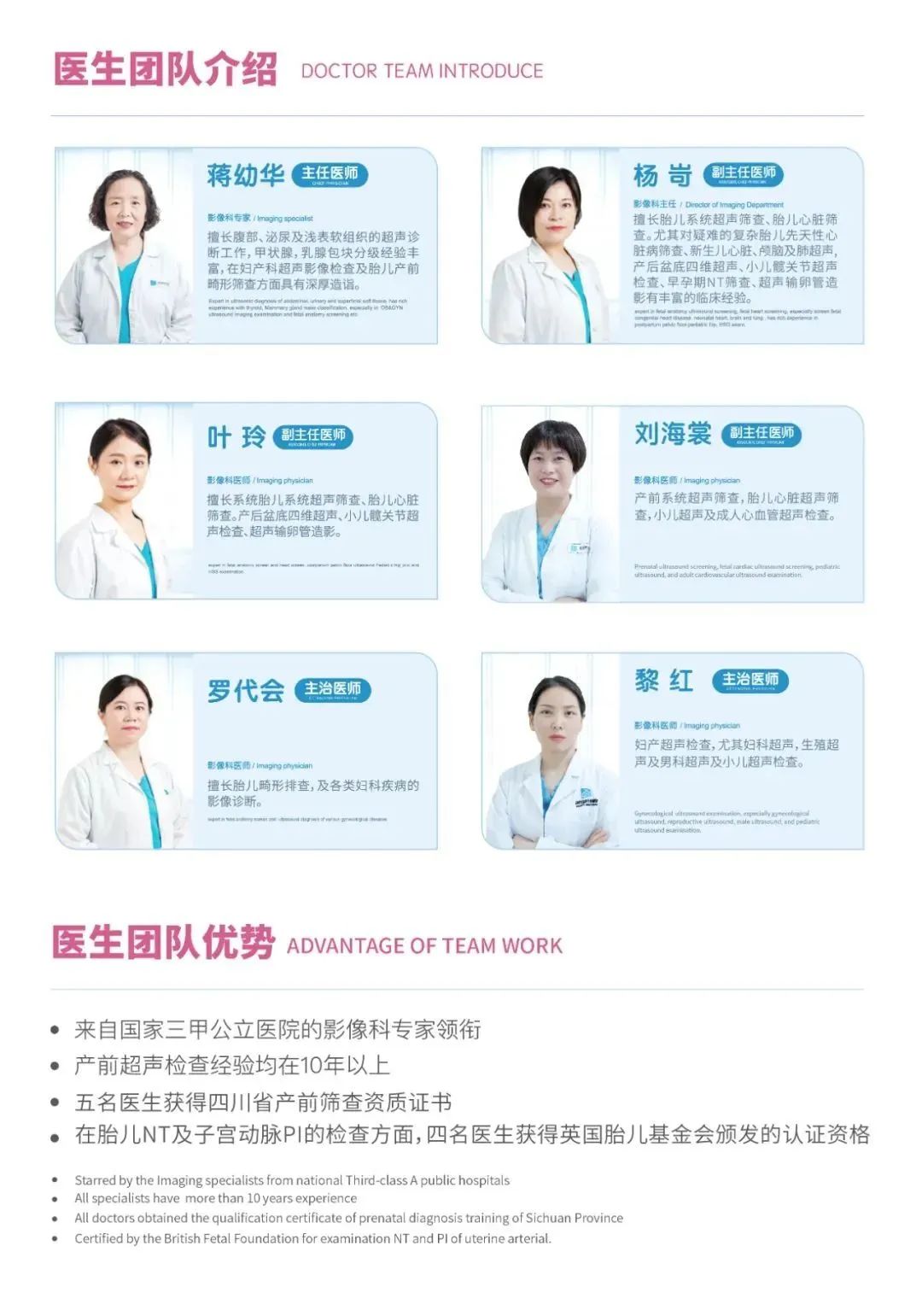 安琪兒產前超聲篩查中心,由產科、婦科、兒科、生殖、普通超聲檢查五大部分組成。兩院共9名醫生獲得了四川省產前篩查資質證書,較早開展了胎兒NT早篩查。